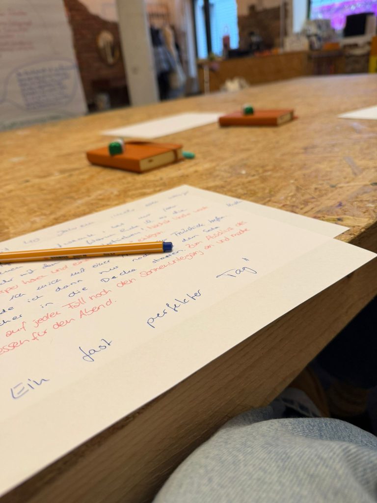 ungefilterte Aufschreiben von Ideen, führt uns in unsere Innenwelt. In Austauschrunden können wir uns gegenseitig Texte vorlesen und besprechen, oder